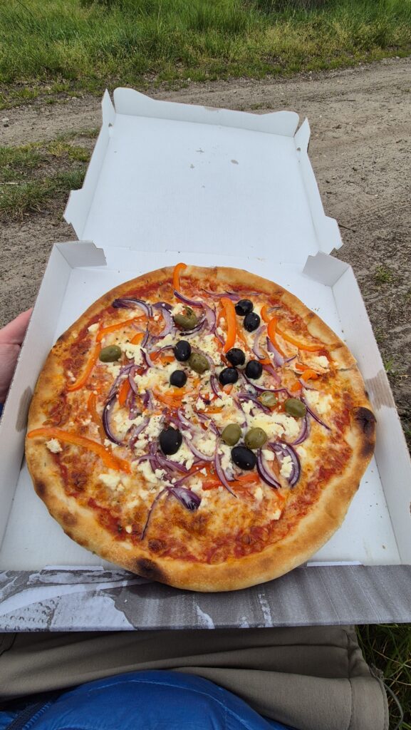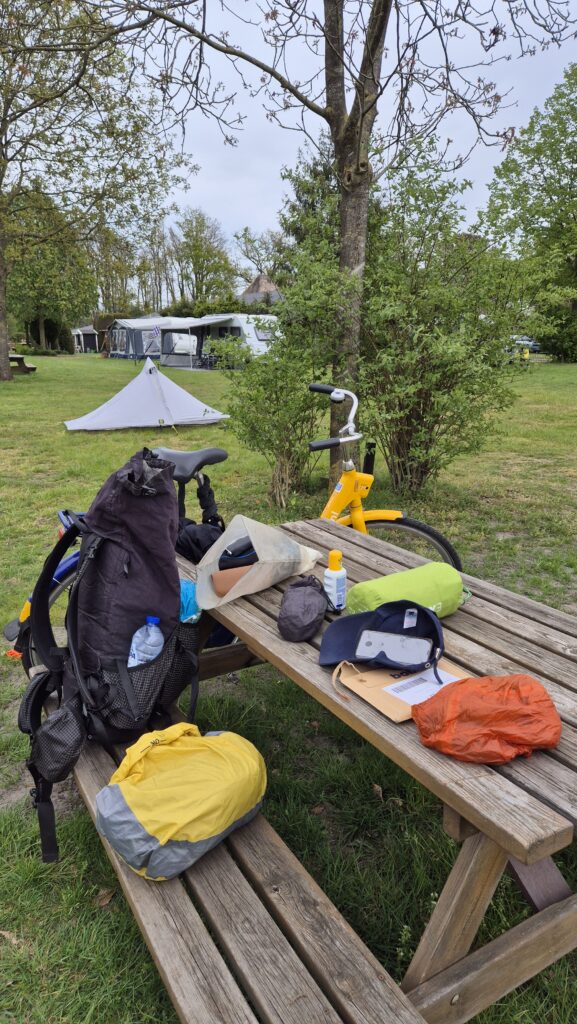 Was warmly greeted at the capsite by the owner, and he gave me a prime piece of real estate in the center of the field. Pitched my tent, and treated myself to a blisfully hot shower. Chatted some with the neighbors (who live only a couple of villages away from my own home town) and got on the bike again back to the Holten for some food. The restaurant was filling up quickly so I decided to get my pizza to go. Found me a nice spot and enjoyed the (somewhat ironically titled) greek sensation. No surprise that after a day of hiking, it tasted mighty fine. My neigbors mentioned it gets very cold during the nights and mornings, so thermals are on, and am ready to call it an evening (at 1900). No chance of sleeping yet, so it’ll be reading and possibly a series on the phone. Sayonara.